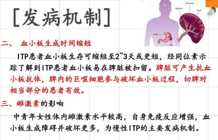 ITP是身体免疫功能出现了紊乱,多数是相对“亢进”状态,导致血小板破坏增多,同时,骨髓中的巨核细胞释放血小板障碍,所以进入血液中的血小板不足,它是个全身性疾病。中医认为ITP紫癜出血症状,与古代“血证”、“肌衄”、“紫斑”比较相似,主要与气血不和,血溢脉外有关。