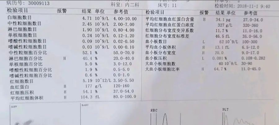 | 仅此作为医学参考资料。 1.我在青海格尔木工作,海拔2800米左右。2018年10月份由于胃疼,去医院做了胃镜,胃底:黏膜充血肿胀,可见点状黏膜糜烂、出血,粘液湖呈淡黄色,中量。皱襞呈脑回状,血管未见。诊断结果:非萎缩性胃炎伴糜烂,出血,胆汁反流。幽门螺旋杆菌两个加号。输了四天液,四连用药两周。 2.就在这时,做血常规时,发现我血小板只有62